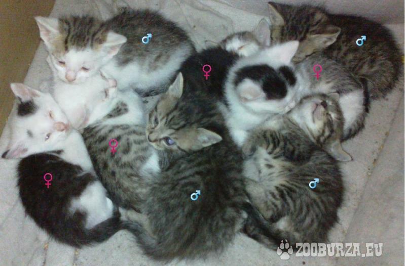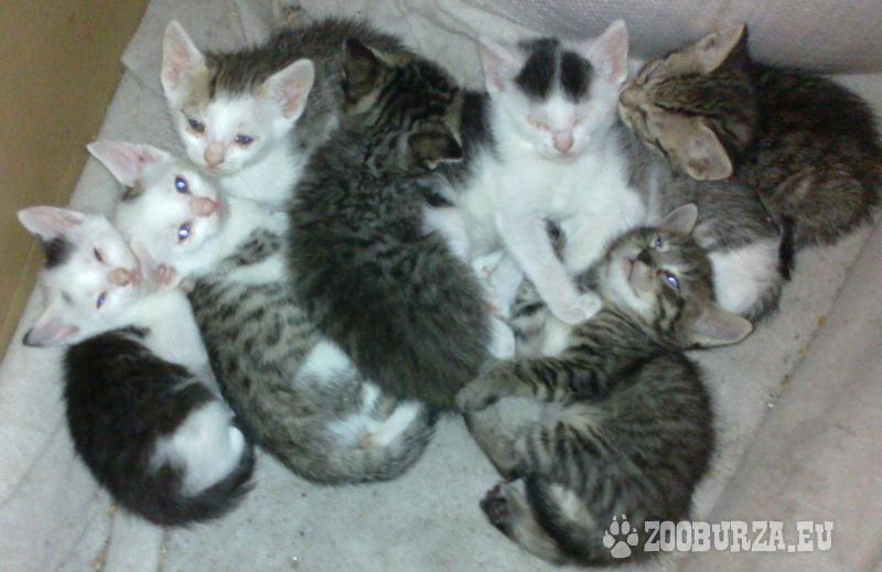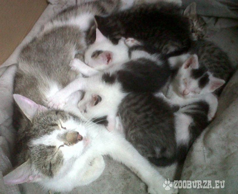 Popis: Darujem do dobrých rúk 8 4-týždňových malých mačiatok (4 kocúri - 3 tmavohnedí prúžkovaní + 1 sivo-biely fľakatý, 4 mačky – 2 bielo-čierne fľakaté + 2 sivo-biele fľakaté. Narodili sa 7. a 13.5. Sú to mačičky dvoch rôznych mačiek (sivo-biela fľakatá, celá čierna s malým bielym fľakom), starajú sa o ne spolu, tak neviem posúdiť, ktorú si čie. Sú to kľudné mačky a vynikajúci lovci. Malé mačičky sú prítulné a hravé. Očkované neboli. Bol by som rád keby do nového domova odišli aspoň po dvojiciach, alebo ak už samé, tak k iným mačkám. Odber možný od polovice júna. Volajte 0915 042 984 alebo 0948 271 691, prípadne mail. Lokalita: Veľký Kýr, okres NZ