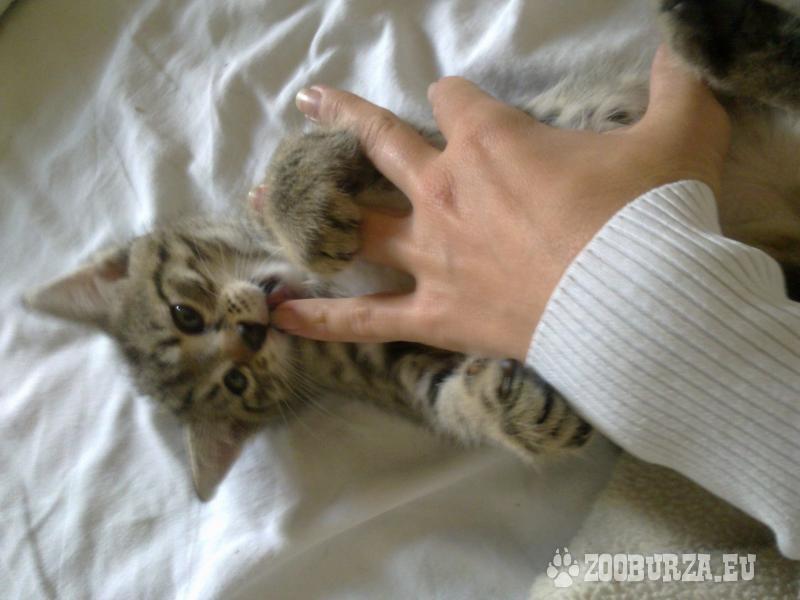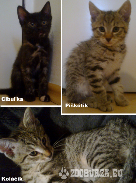 Popis: Ponúkam na adopciu 3 mačiatka narodené 14.3.2014 pouličnej mačke, ktorú sme si prichýlili. Tigrovaní kocúrici sú dvaja, jeden tmavší a jeden svetlejší, obaja majú peknú kresbu, mačička je korytnačinová s jedným ryšavým prstíkom. Sú zdraví, majú osvojené hygienické návyky. Pracujem v občianskom združení na ochranu opustených mačiek, takže adopciou takéhoto zvieratka uvoľníte miesto inej mačičke z ulice, ktorá to potrebuje. Som z Bratislavy, moje tel.č.: 0915 436 647, kľudne volajte ohľadom info.