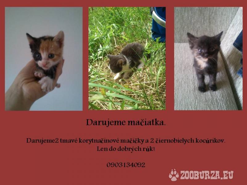 Popis: Darujem mačiatka. Máme k dispozícií 2 tmavé korytnačinové mačičky a 2 čiernobielych kocúrikov. Majú v súčasnosti asi 5 týždňov. Len do dobrých rúk! Vieme doviezť na trase Bratislava - Brezová pod Bradlom - Dubnica nad Váhom, možno aj inde :)
