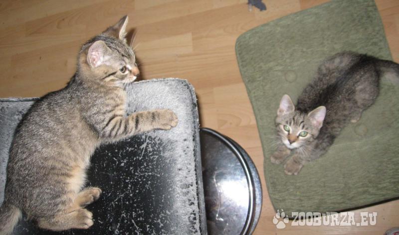Popis: Kocúrik a mačička (súrodenci) hľadajú svoj nový láskyplný domov. Majú 2 a pol mesiaca, kocúrik je trošku väčší a tmavší a mačička má od neho trošku svetlejšiu srsť. Obaja majú krásne zelené oči - mačička svetlejšie. Sú veľmi zvedavé a hravé, majú radi ľudskú spoločnosť, hladkanie a hračky. Papajú už všetko a sú naučené na mačací záchod. Hodia sa aj do bytu, alebo domu s prístupom dnu. Pôvodne boli zachránené z ulice a cez organizáciu mačky-s.o.s veterinárne ošetrované, čiže sú odčervené, vakcínované a nemajú parazity. Cena 15 eur je za všetky veterinárne úkony, ktoré by inak vyšli oveľa drahšie. Momentálne sú v dočasnej starostlivosti v Košiciach. Len do dobrých a starostlivých rúk.