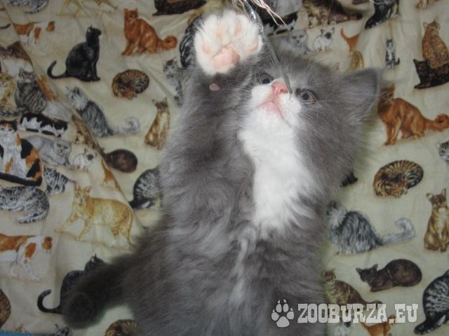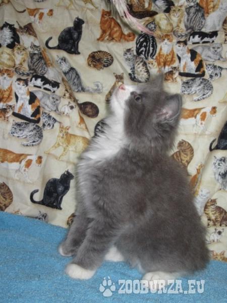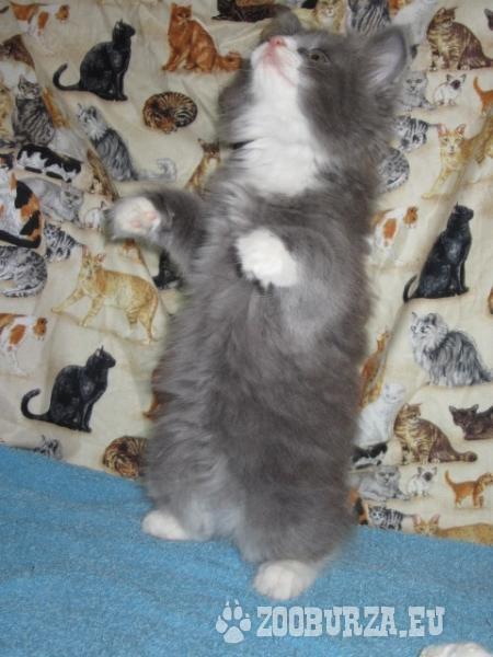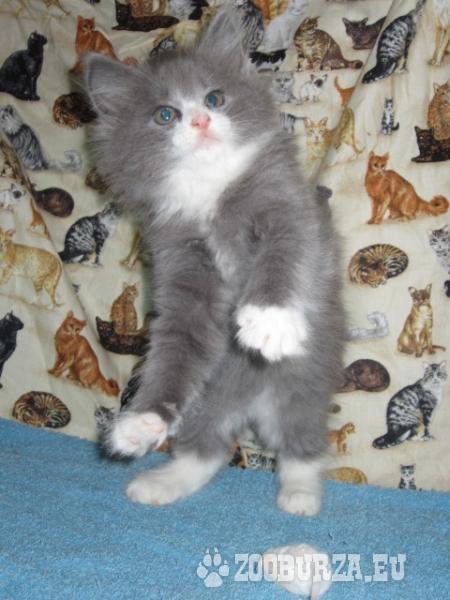 Popis: Ponúkam krásne mačiatko plemena nórska lesná mačka, pohlavie kocúrik, farba modro-biela. Je očkovaný, odčervený, naučený 100%-tne hygienickým návykom.