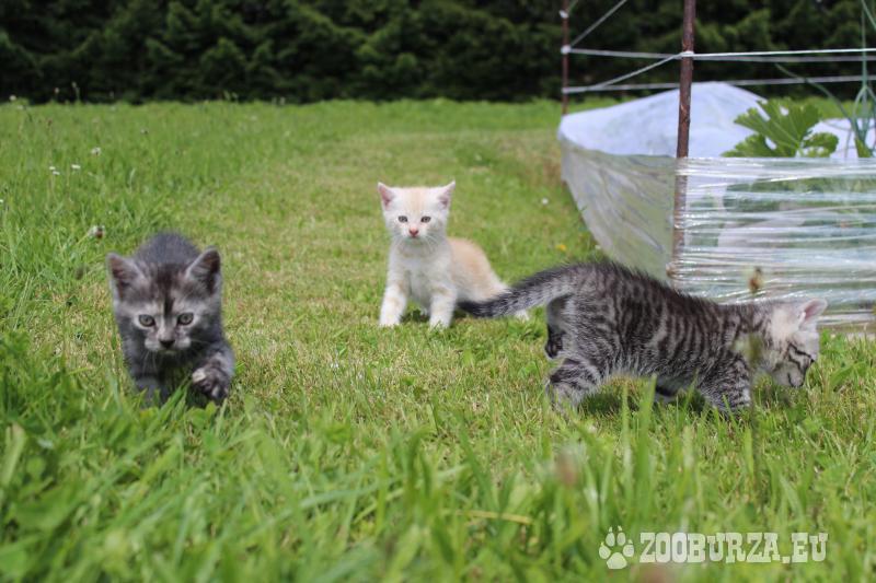 Popis: Darujem do dobrých rúk mačiatka, šedé sú mačky, ryšavý je kocúr. Sú smelé, hravé, od narodenia v kontakte s ľuďmi. Už v podstate samostatné, prikrmované. Narodili sa 7.5.2025, odber možný od 25.5.2025, najlepšie v podvečernom čase. Bývam v obci Smilno, okres Bardejov. Kontakt: 0901757373